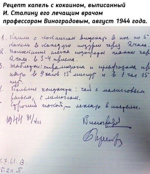 Ради справедливости нужно отметить, что использование большинства из упомянутых препаратов в сталинские времена было разрешено и наркоманов они не интересовали. Да и товарищ Сталин вряд ли бы варил у себя на кухне какую-нибудь «вкусняшку» из своих лекарств. Но даже в несколько «отфильтрованной» папке со сталинскими историями болезни есть факты использования Сталиным, по назначению врачей конечно же, препаратов, которые в то время были запрещены к употреблению.